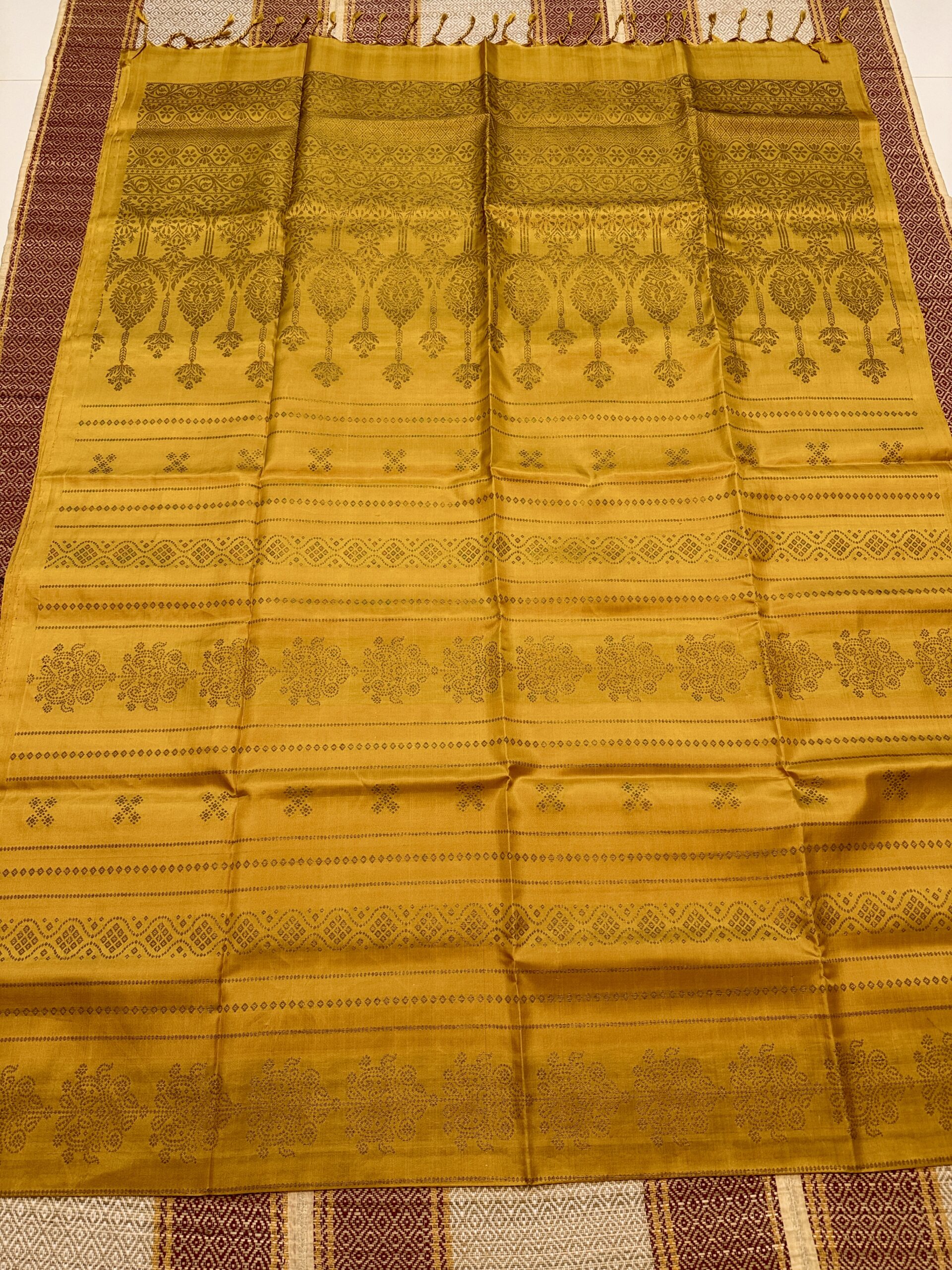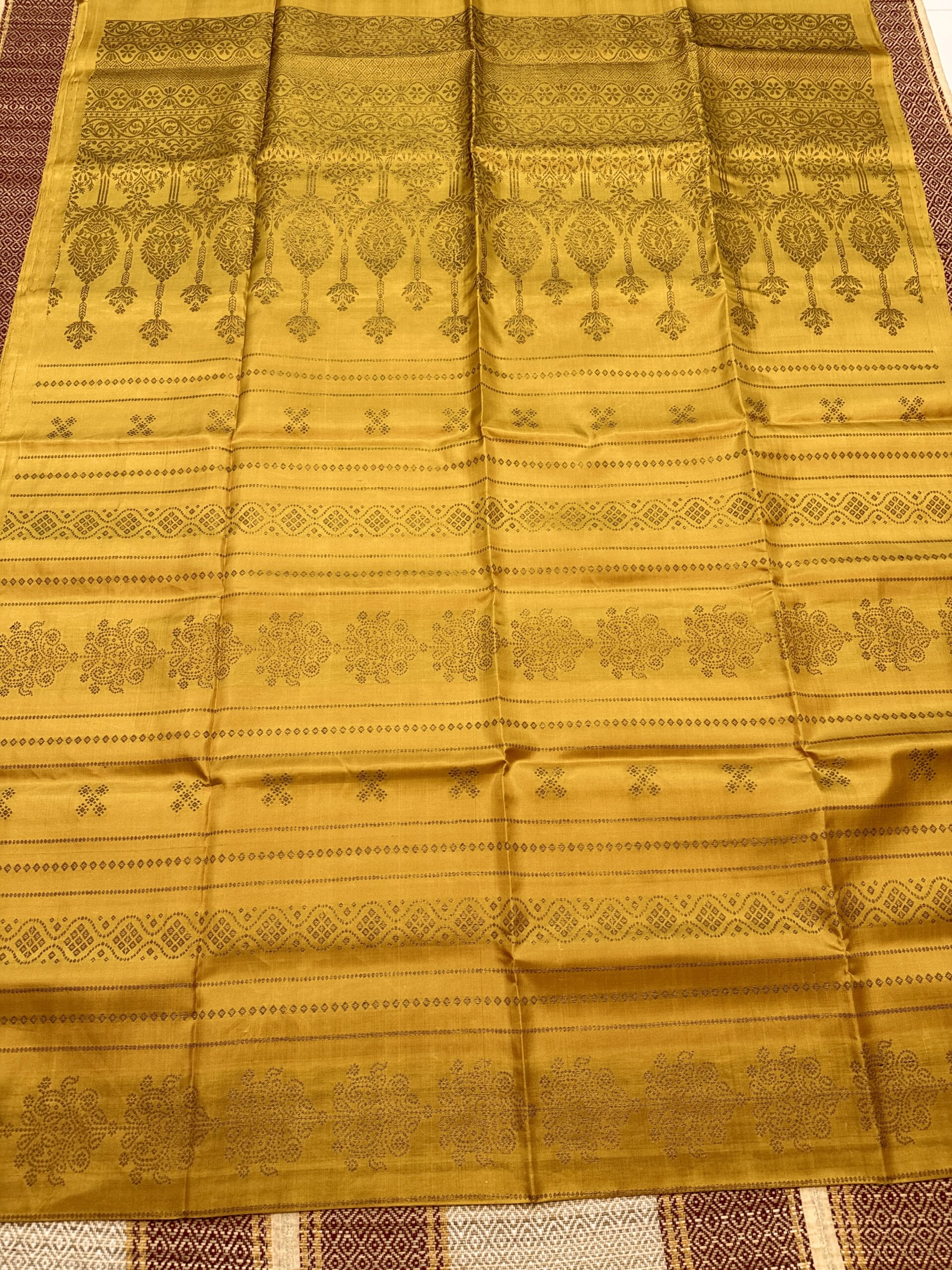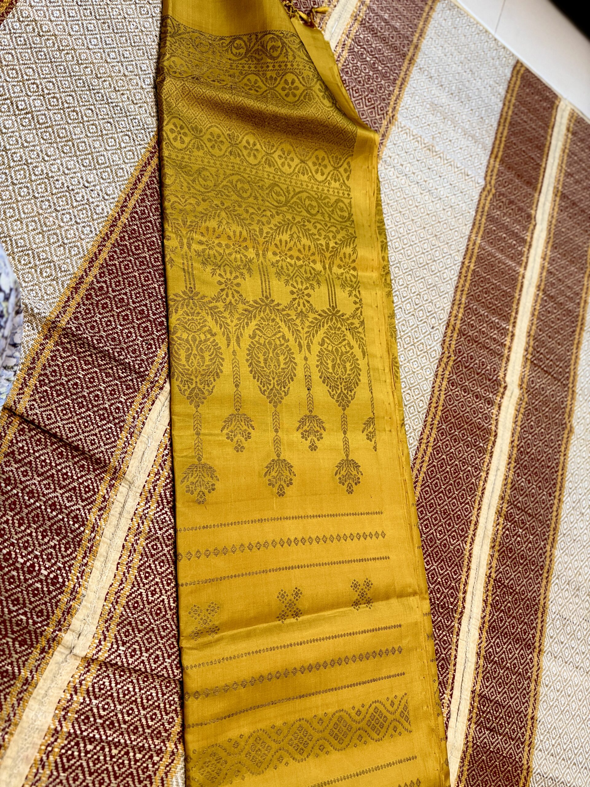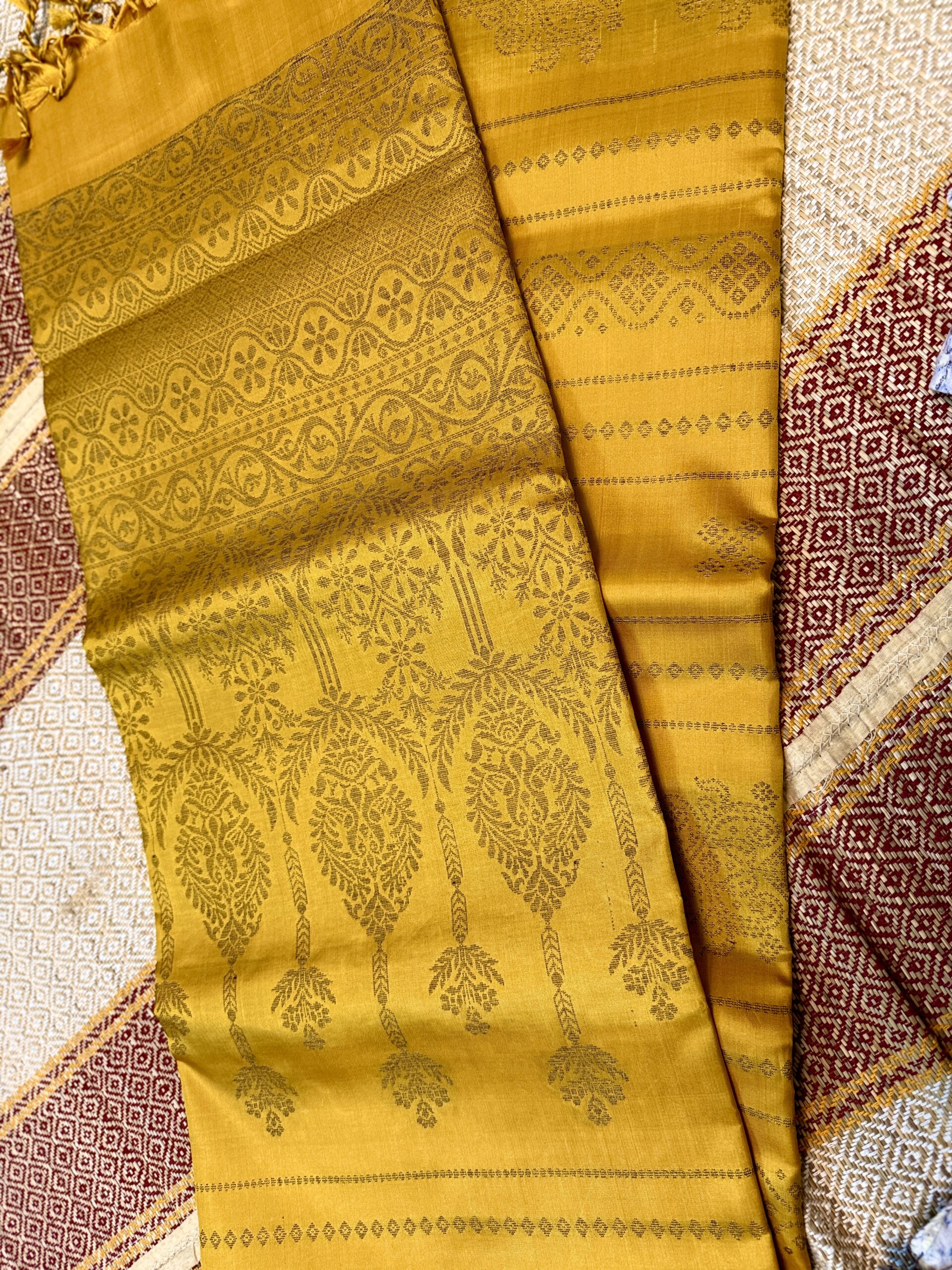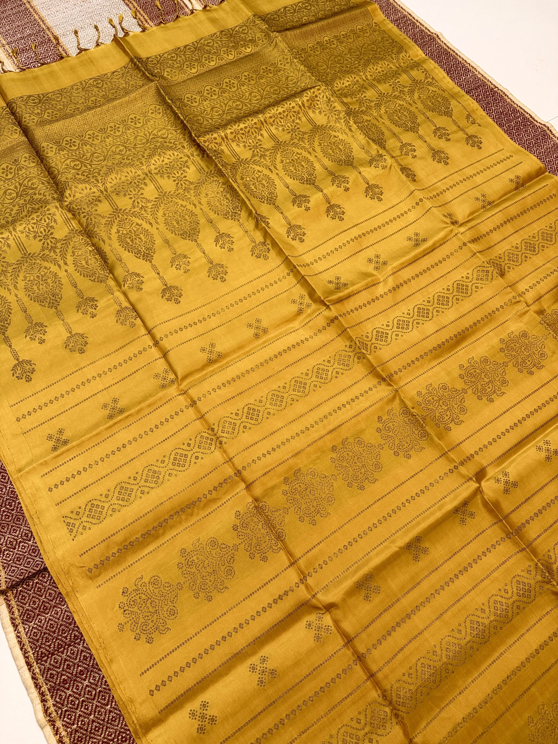 Feather lite Soft silks in mustard , a very crispy silk pattern with the beautiful floral motifs, a monotoned saree.