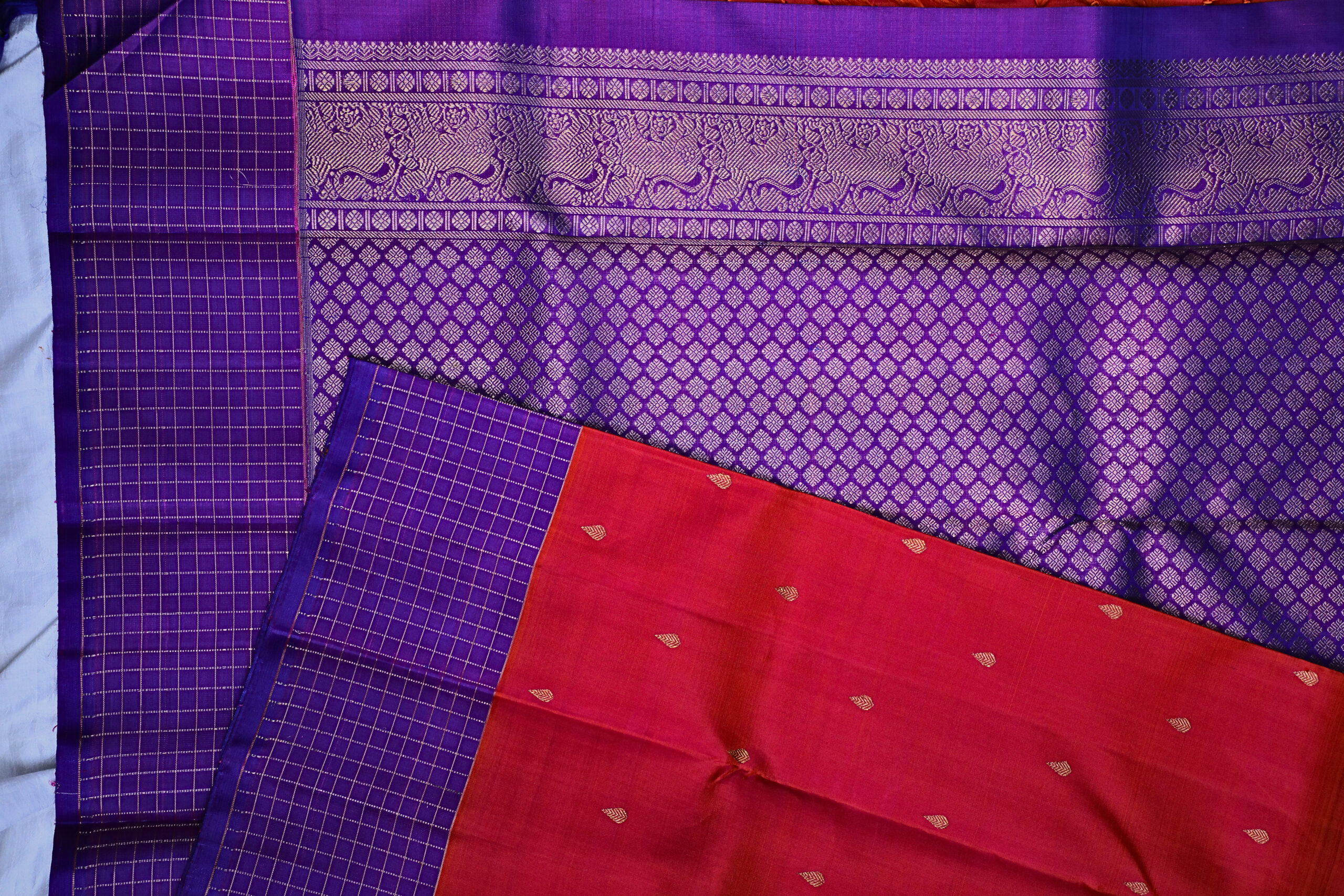 Pure Silk saree with a dual tone vibrant coral pink color with violet border with a pretty zari checks and pallu with zari work in violet with buttas all over. violet contrast blouse