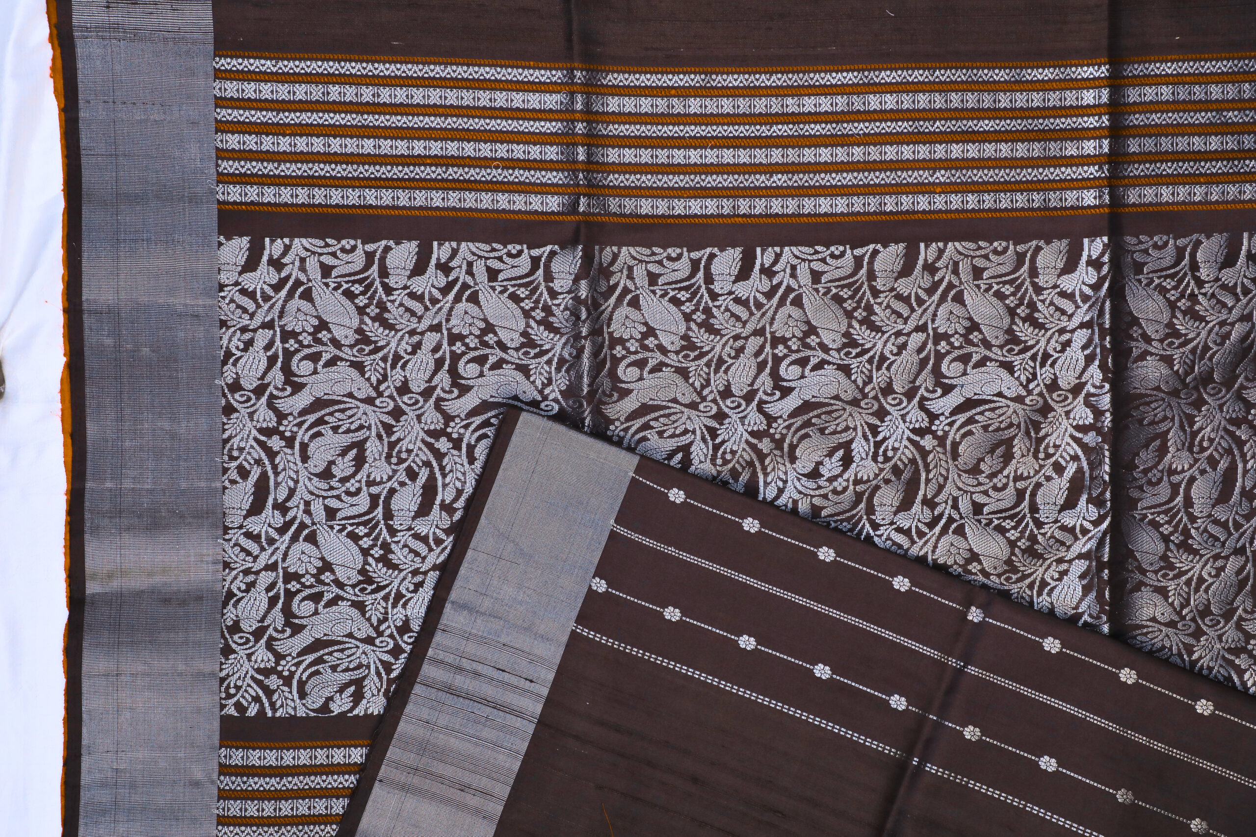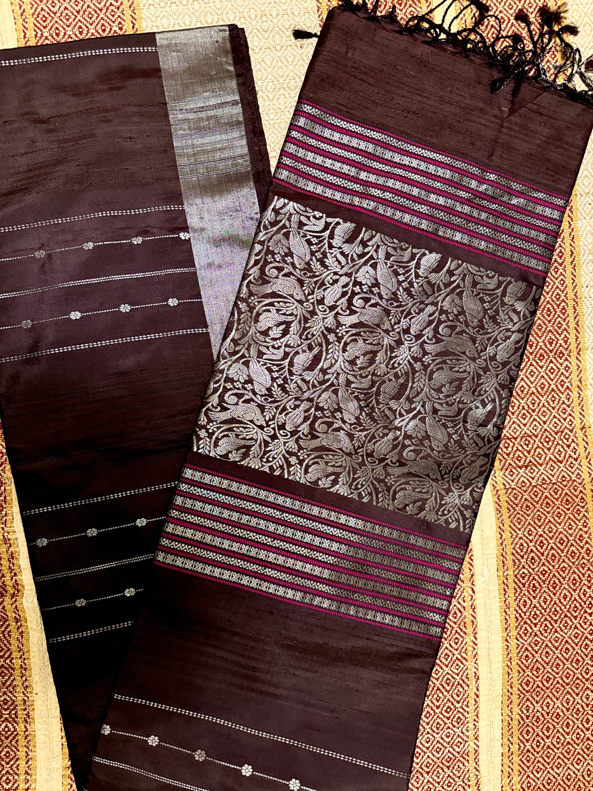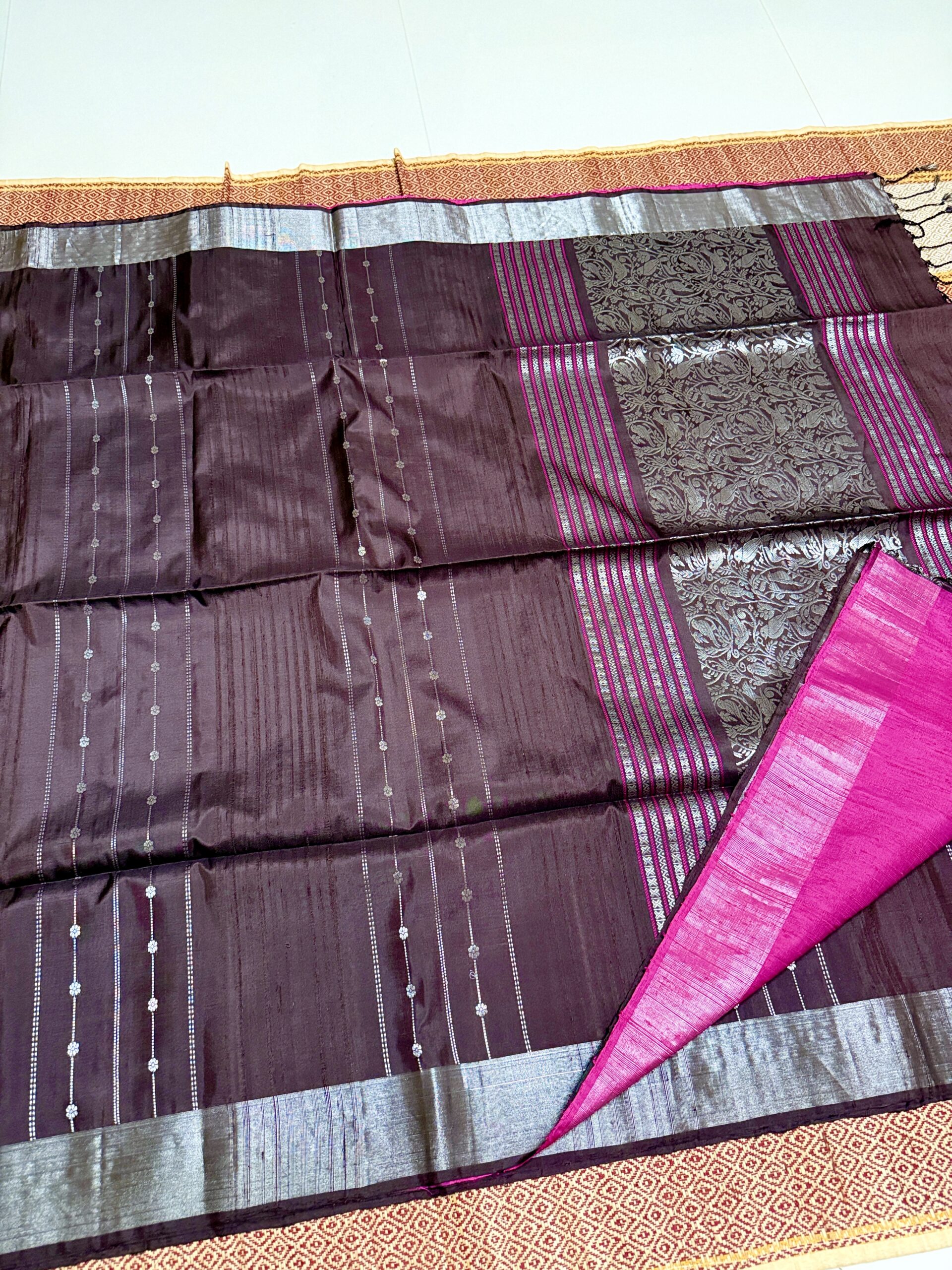 Beautiful coffee brown saree with Dupion pallu and brocade silver zari floral work with contrast magenta pink as blouse.