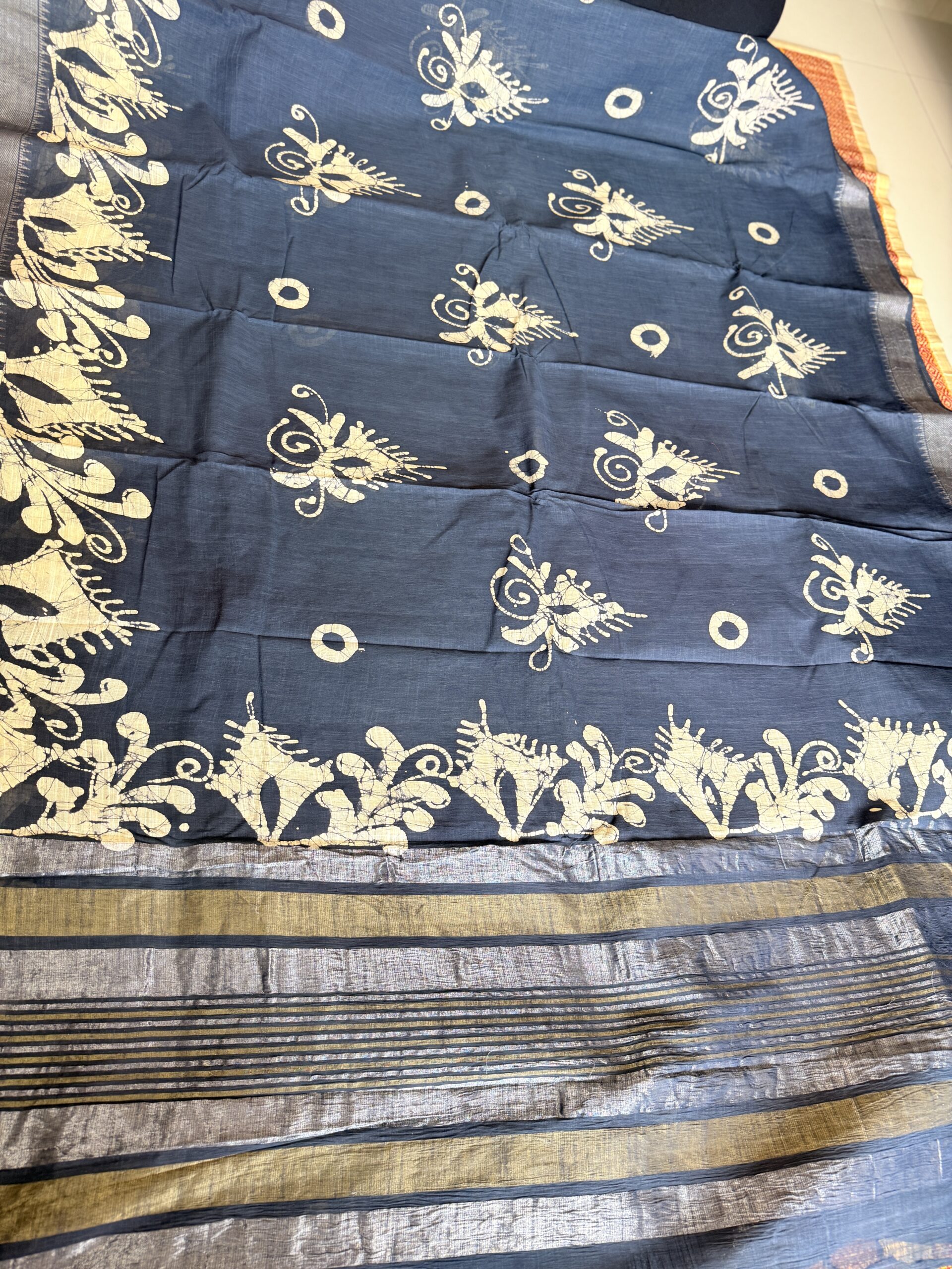 bluish grey color in bathik print in kanchi cotton with silver zari