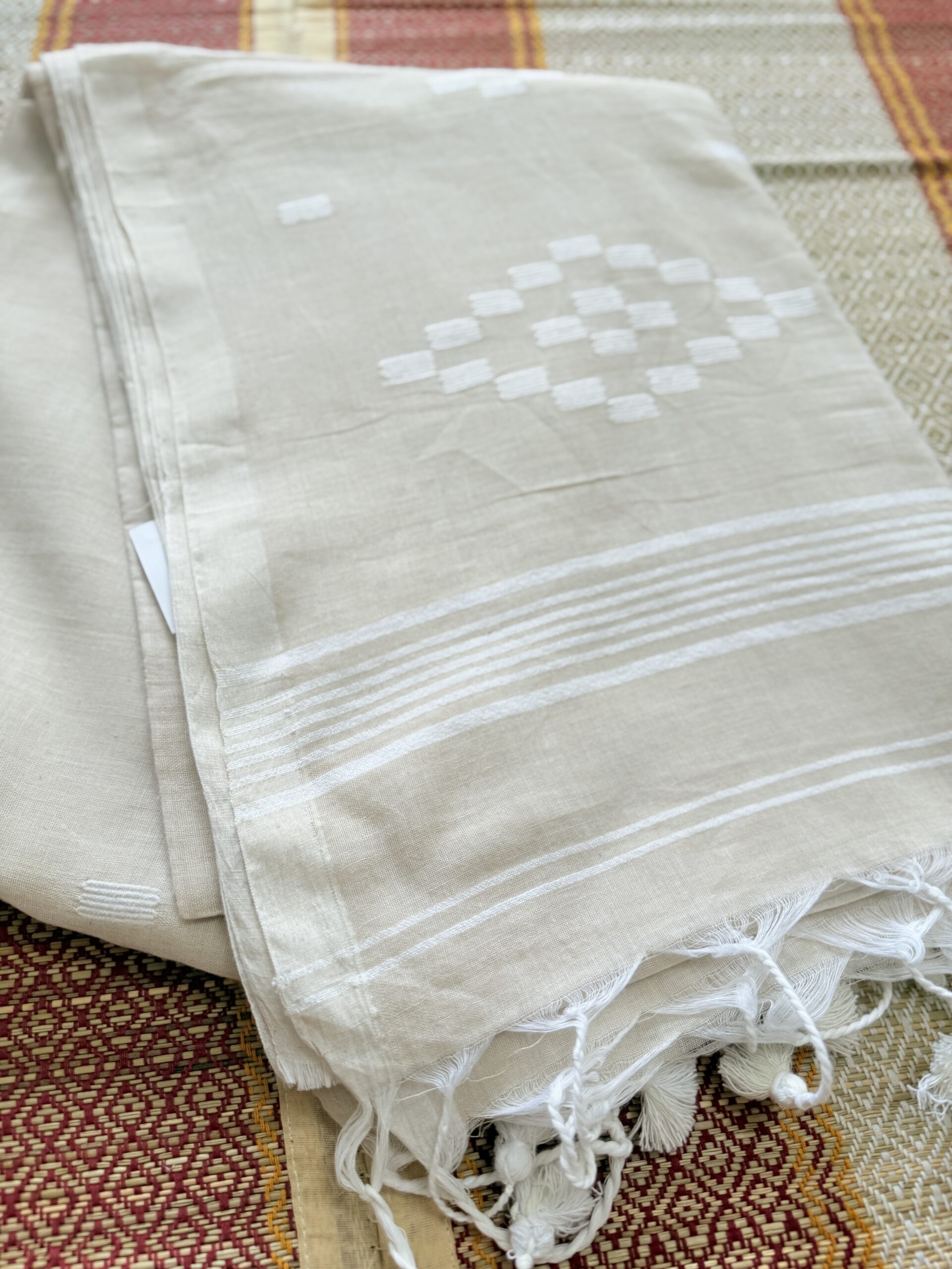 A very Soft weaving saree in light beige with a white thread weaving and subtle border.