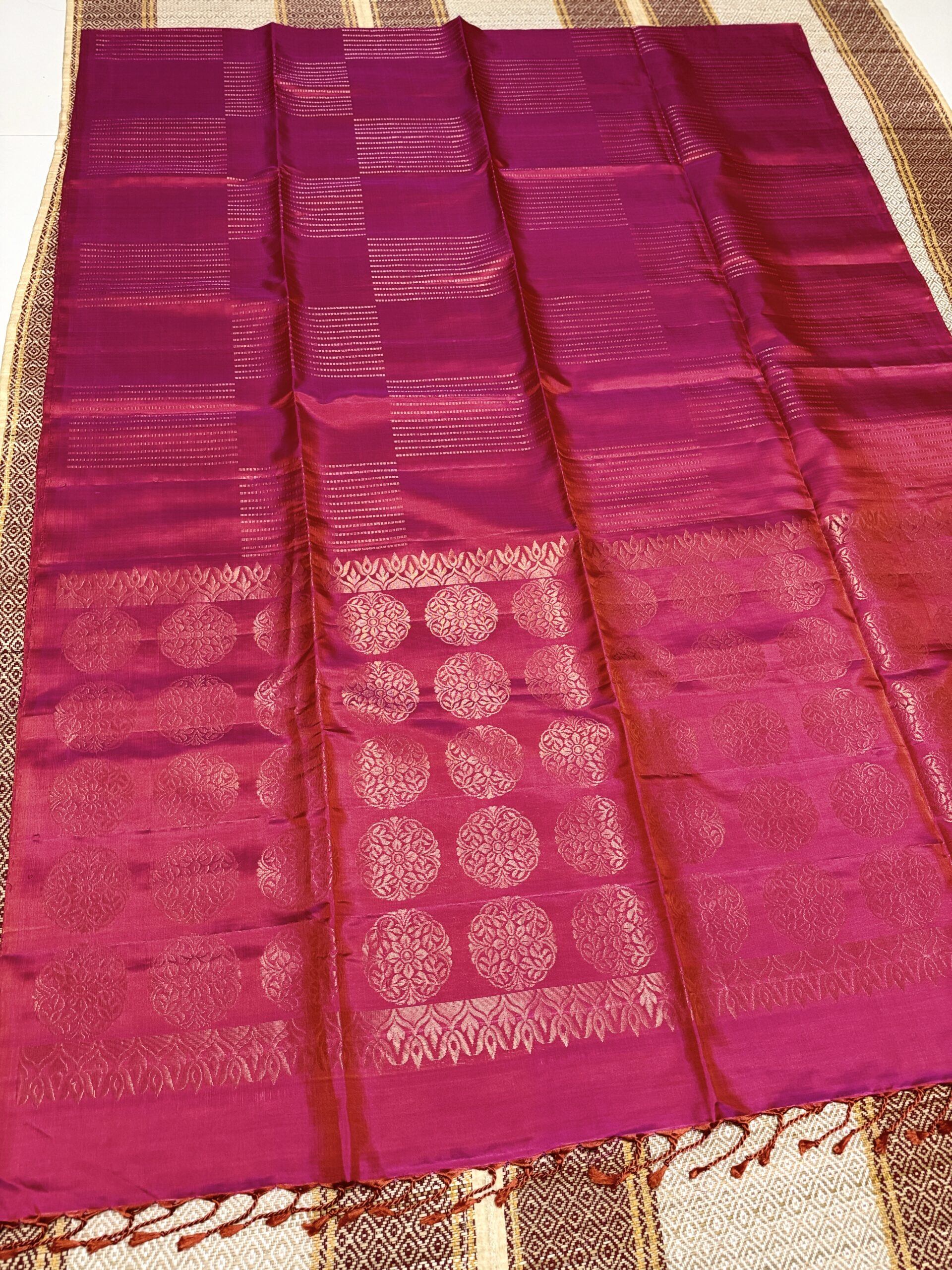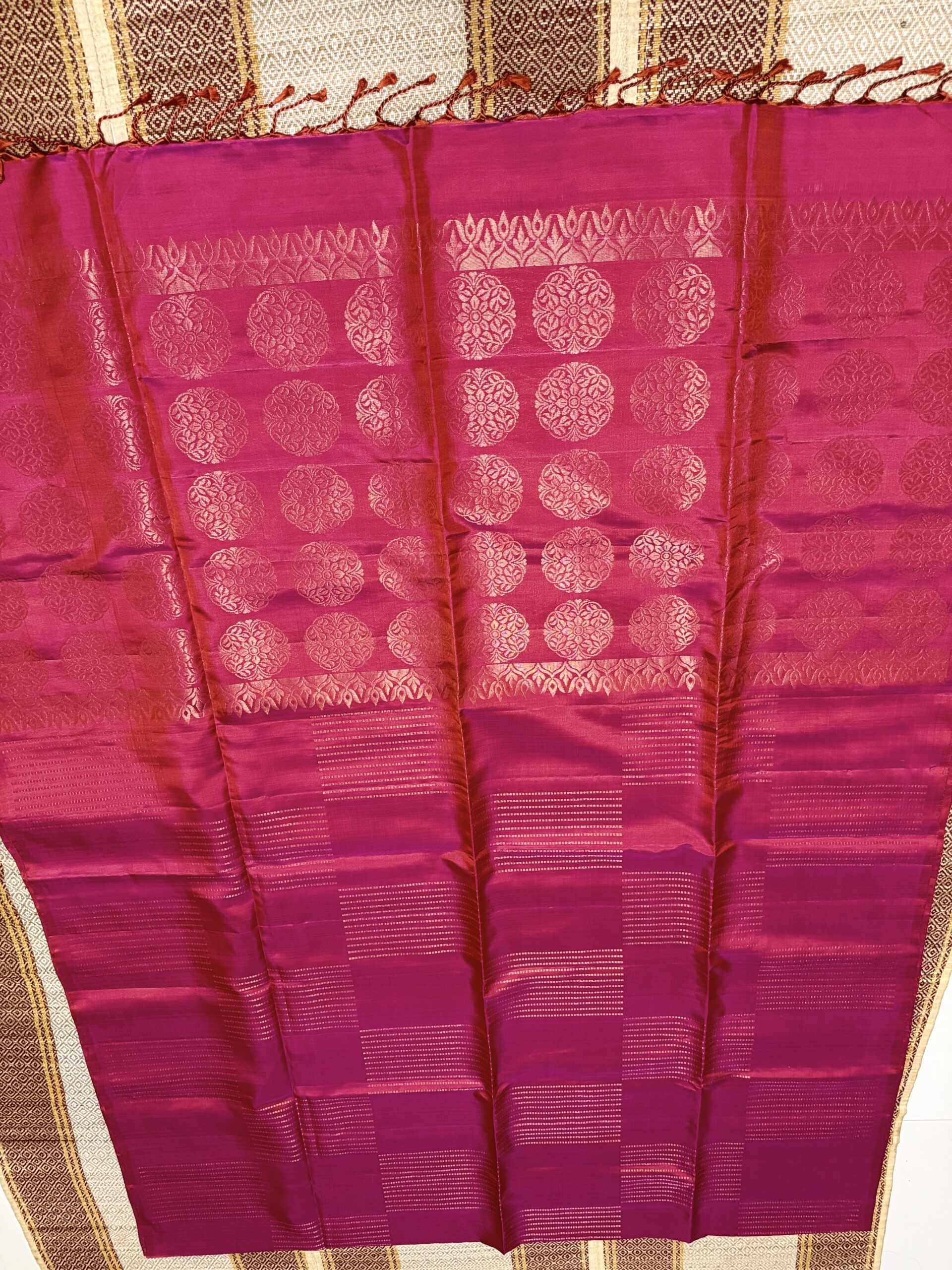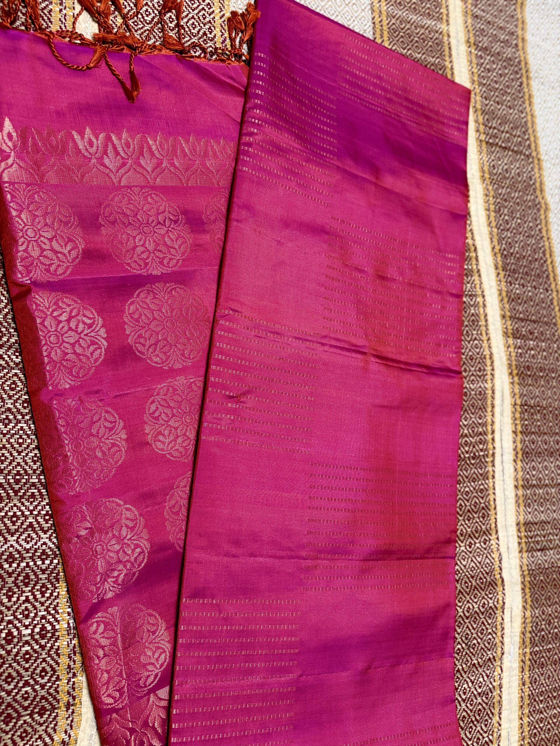 Fuschia to raspberry pink dual tone soft silk premium variety with a beautiful golden sheen zari work.
