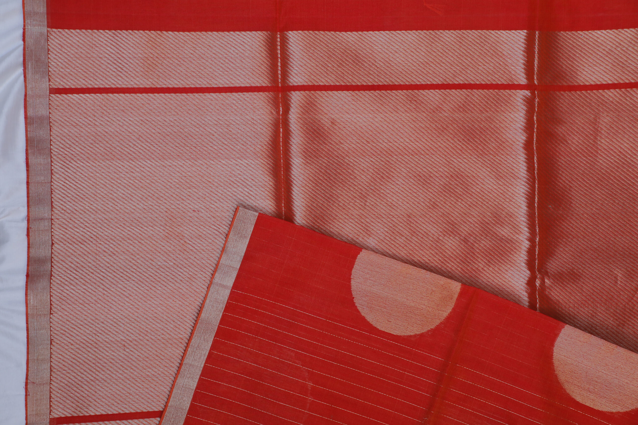 Pure silk cotton 70 percent Silk and 30 percent cotton a very premium variety saree in coral shade with a round silver sheen big butta all over body with a silver sheen line